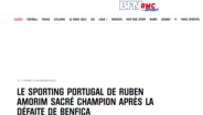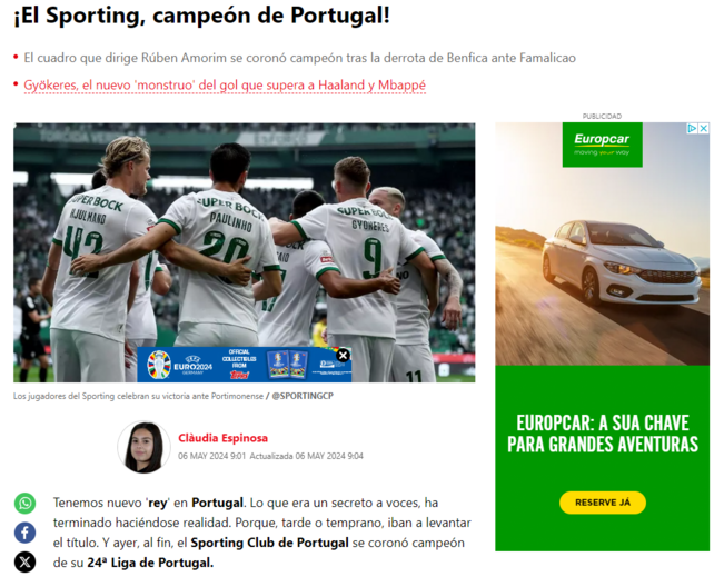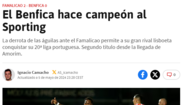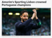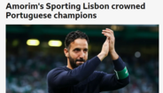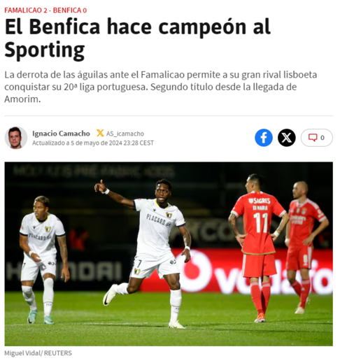O título conquistado este domingo pelo Sporting, depois da derrota do Benfica em Famalicão por 2-0, está em destaque na imprensa internacional. Em Espanha, França, Itália, Inglaterra e Alemanha, o realce é sobretudo dado ao jogo das águias, a Rúben Amorim, "o grande arquiteto do sucesso" e a Viktor Gyökeres, "fundamental para o triunfo final".