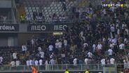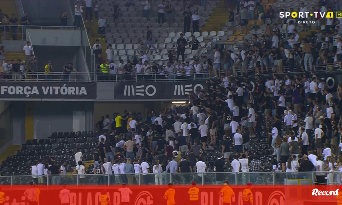 Desacatos nas bancadas do estádio D. Afonso Henriques marcaram os minutos finais do período de intervalo no duelo entre V. Guimarães e Puskás Akadémia, a contar para a segunda pré-eliminatória da UEFA Conference League. Nas imagens capturadas pela transmissão televisiva do encontro foi possível observar os adeptos vimaranenses a atirarem cadeiras na direção da polícia de intervenção que estava no local. [Frames: Sport TV]