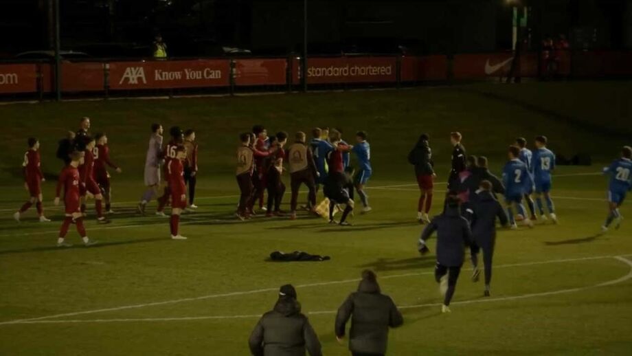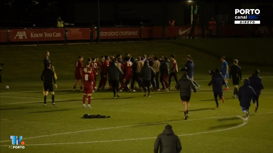 Mal soou o apito final no Liverpool-FC Porto, que ditou o triunfo dos reds e eliminação portista nos penáltis, nos oitavos de final da Liga Jovem da UEFA, jogadores das duas formações entraram em confrontos em pleno relvado. A confusão acabaria por ser sanada alguns segundos depois. Os portistas Candé e Gonçalo Ribeiro foram expulsos após o apito final. [Frames: Eleven Sports e Porto Canal]