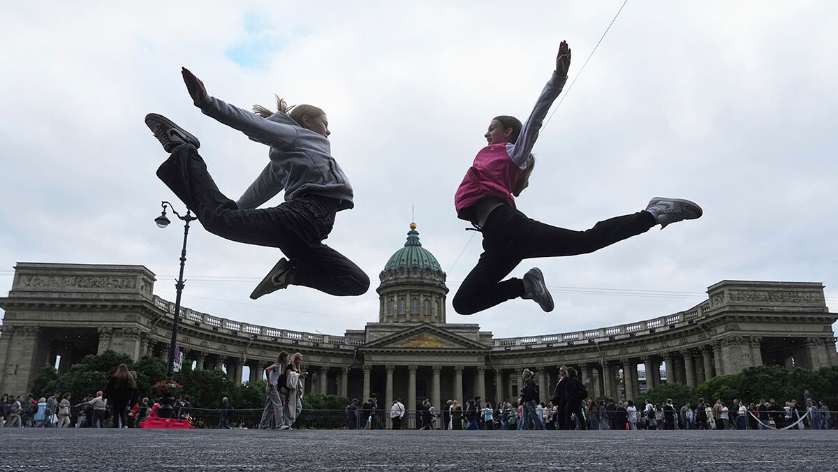 Com a queda do comunismo, São Petersburgo voltou a ter não só a sua designação imperial – deixando para trás as soviéticas designações de Petrogrado e Leningrado –, como também a graciosidade de tempos idos, quando era a capital russa. A praça junto à Catedral Kazansky é um fervilhante centro cultural ao ar livre, onde jovens exibem as suas qualidades atléticas, como este duo de ginastas bem ilustra.