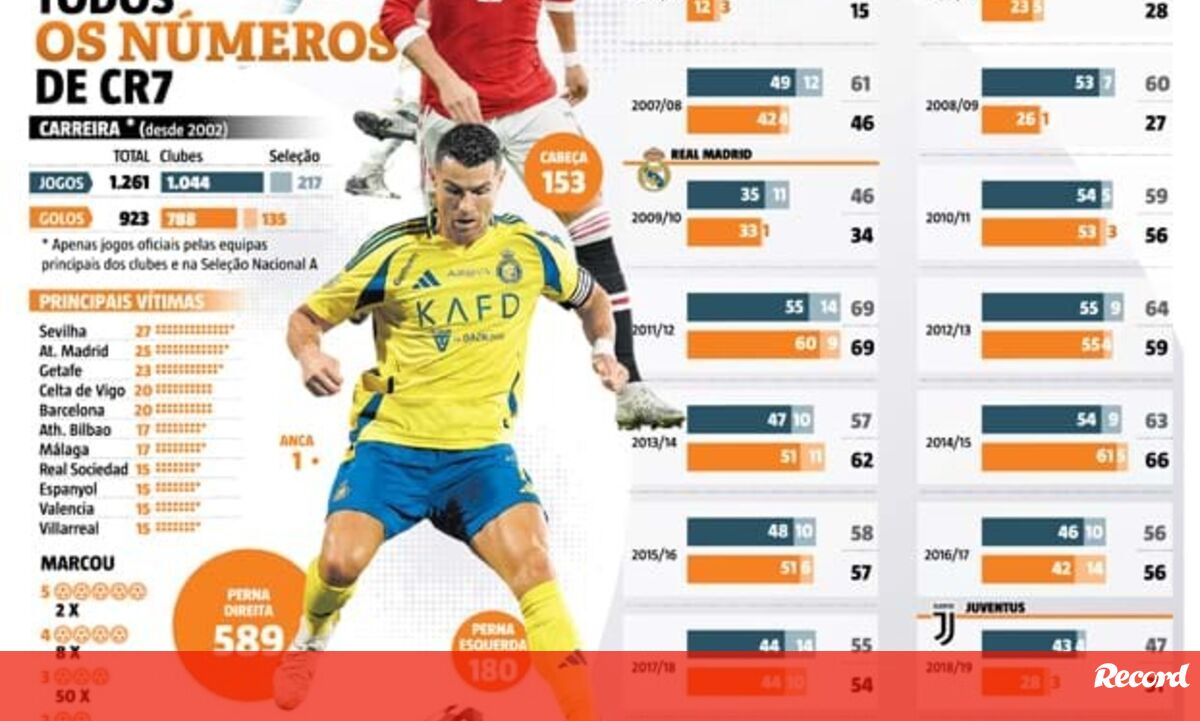 05 fevereiro 2025 - 08:35 As principais 'vítimas', como marca e o registo por época: tudo sobre os 923 golos de Cristiano Ronaldo ... × Funcionalidade exclusiva para assinantes Record Premium Assine para partilhar E usufrua de todas as vantagens de ser assinante Este conteúdo é exclusivo para assinantes Record Premium Assine Já Se já é assinante faça login Deixe o seu comentário Para poder guardar esta notícia deverá efectuar login. Caso não esteja registado no site do Record, efectue o seu registo gratuito. 05.02.2025 As principais 'vítimas', como marca e o registo por época: tudo sobre os 923 golos de Cristiano Ronaldo Deixe o seu comentário
