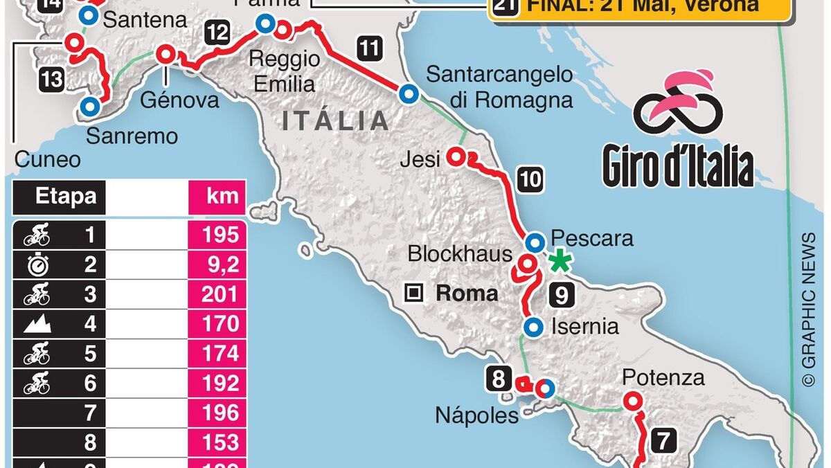 A 105.ª edição da Volta a Itália começa em Bucareste, na Hungria, a 6 de maio, e termina com um contrarrelógio na histórica cidade de Verona ao fim de 21 dias e 3.421km