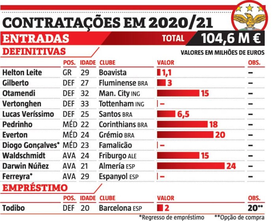 Com a contratação de Lucas Veríssimo, o Benfica ultrapassou os 100 milhões de euros gastos em aquisições, numa época em que já tinha sido estabelecido um recorde.