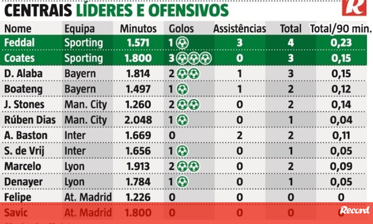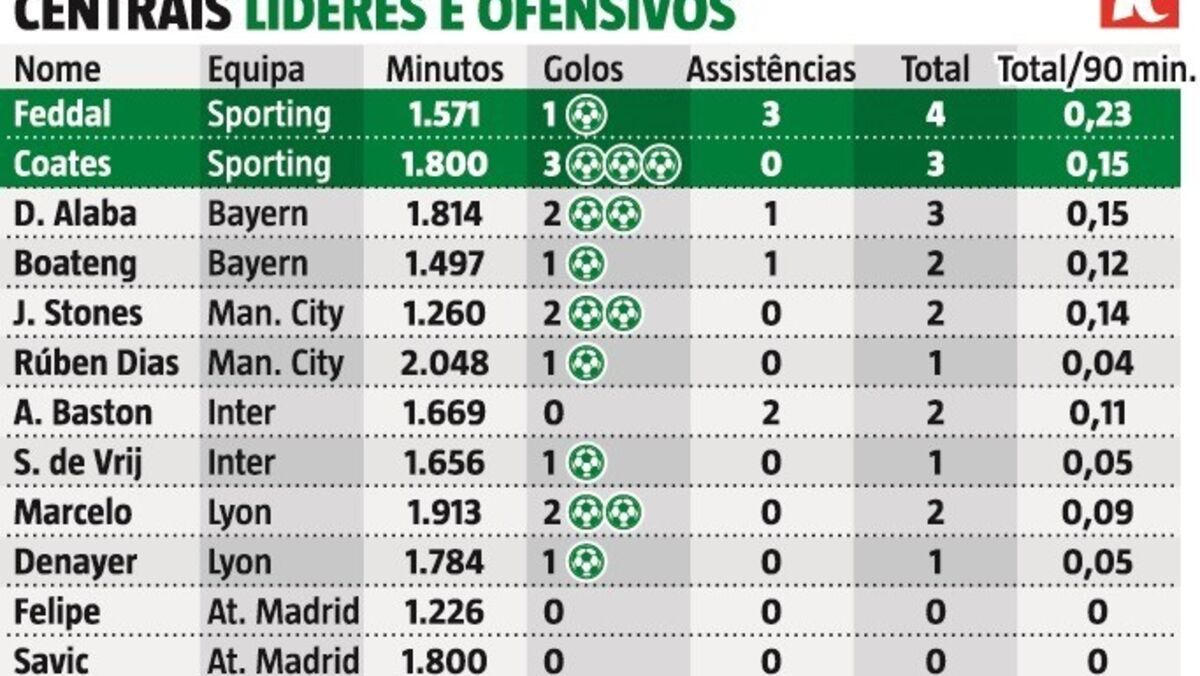 Coates e Feddal são a dupla defensiva com maior peso ofensivo nos líderes das principais ligas
