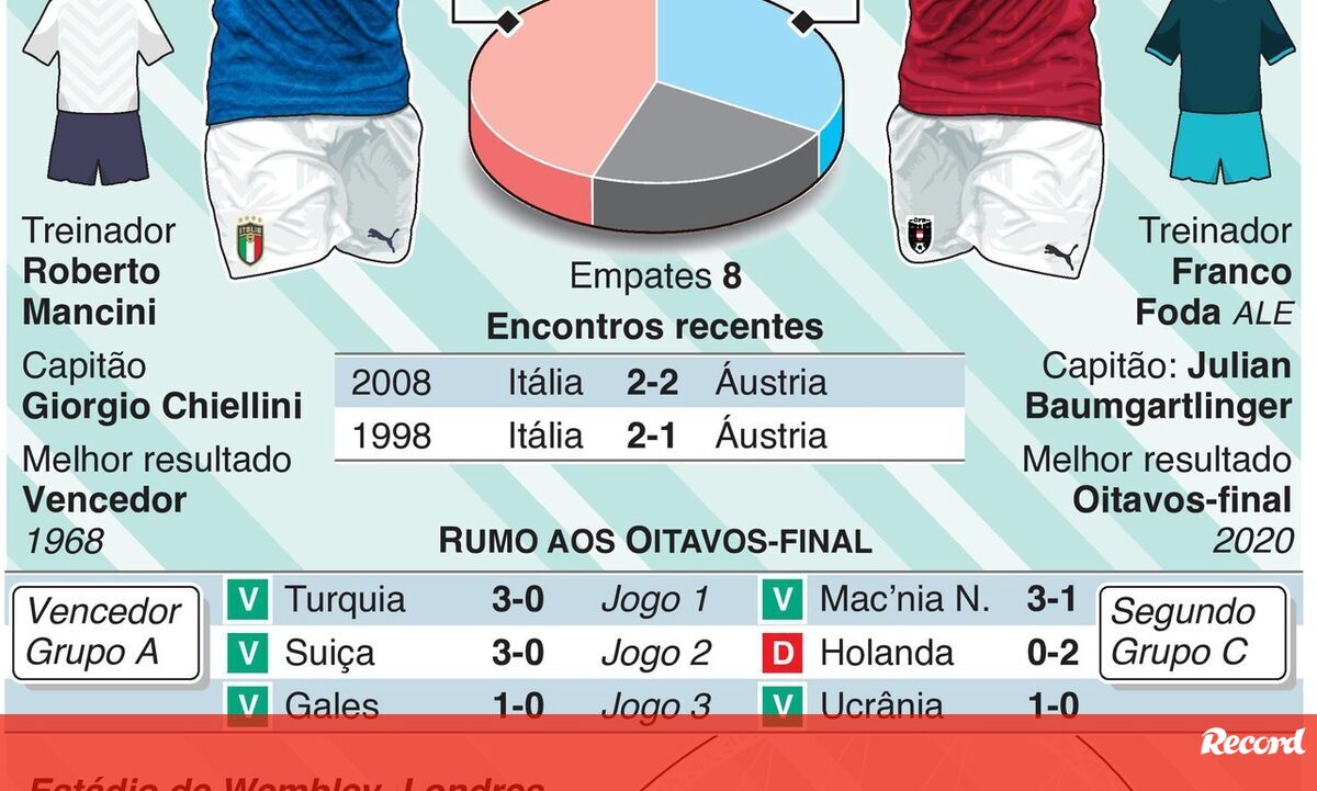O Itália-Áustria será o segundo jogo dos oitavos de final do Euro'2020. Está marcado para sábado, às 20h00. Consulte esta infografia de lançamento deste encontro.