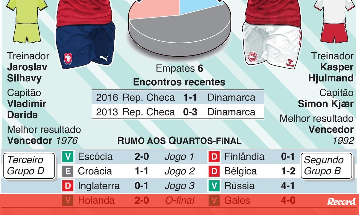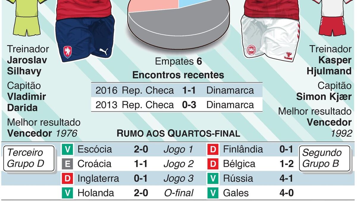 O República Checa-Dinamarca, dos quartos de final do Euro'2020, está marcado para sábado, às 17h00. Consulte esta infografia de lançamento deste encontro.