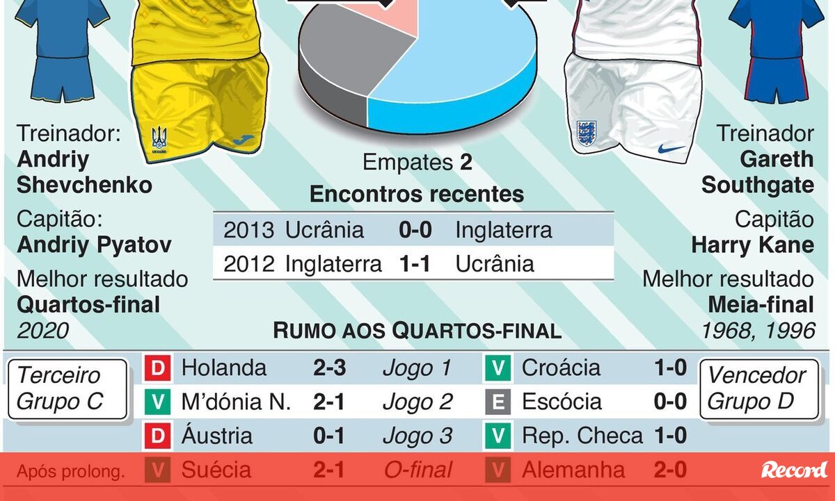 O Ucrânia-Inglaterra, dos quartos de final do Euro'2020, está marcado para sábado, às 20h00. Consulte esta infografia de lançamento deste encontro.
