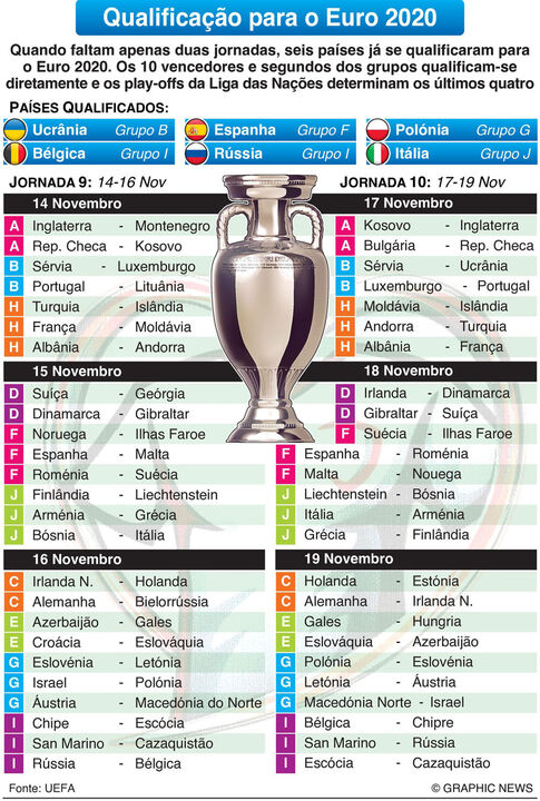 As últimas 14 vagas diretas para o Euro'2020 vão ser decididas de quinta a terça-feira, nas duas últimas jornadas da face de qualificação, com Portugal, campeão em título, a tentar evitar os playoffs. Com a líder Ucrânia já apurada, Portugal depende apenas de si para assegurar a outra vaga no grupo B e, com a Sérvia a um ponto de distância, precisa de vencer a Lituânia, na quinta-feira, no Algarve, e na visita ao Luxemburgo, no domingo, independentemente dos resultados dos sérvios.