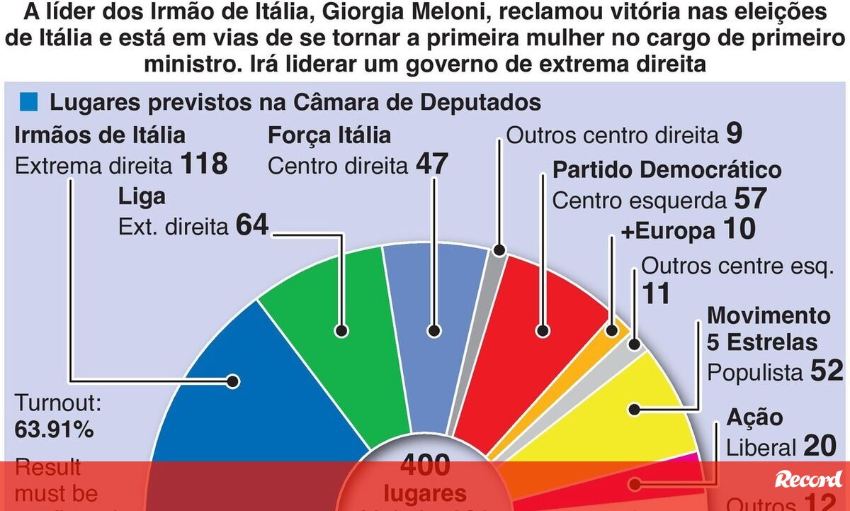 A líder do Fratelli d'Italia (Irmãos de Itália), Giorgia Meloni, reclamou vitória nas eleições de Itália e está em vias de se tornar a primeira mulher no cargo de primeiro ministro. Irá liderar um governo de extrema direita, o mais à direita desde a II Guerra Mundial.