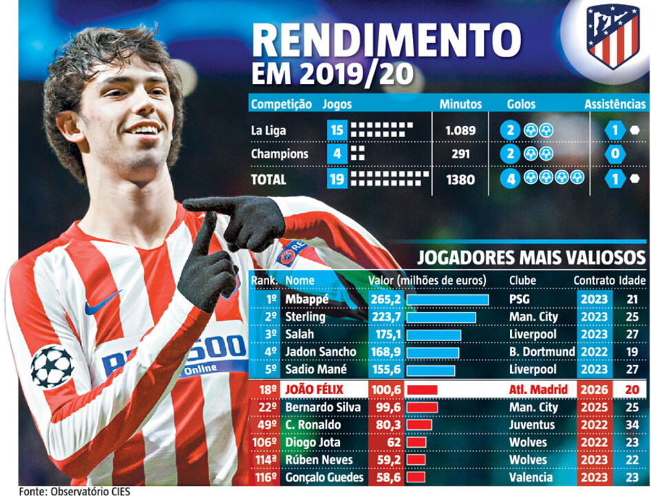 Apesar da fase negativa, João Félix, avançado português do At. Madrid, ultrapassa Bernardo Silva como o luso com maior valor de mercado