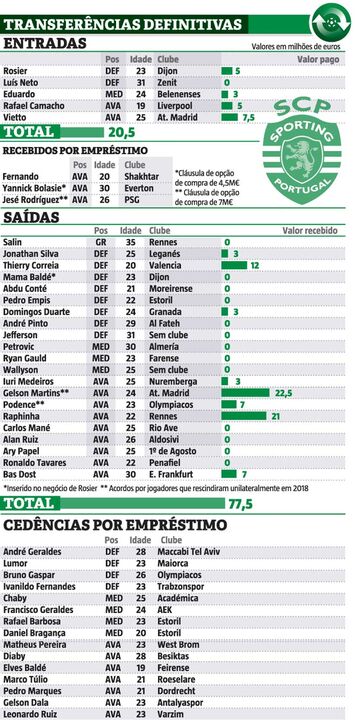 03 setembro 2019 - 13:06 Mercado de transferências do Sporting: entradas, saídas e os milhões negociados ... × Funcionalidade exclusiva para assinantes Record Premium Assine para partilhar E usufrua de todas as vantagens de ser assinante Deixe o seu comentário Para poder guardar esta notícia deverá efectuar login. Caso não esteja registado no site do Record, efectue o seu registo gratuito. 03.09.2019 Mercado de transferências do Sporting: entradas, saídas e os milhões negociados Deixe o seu comentário
