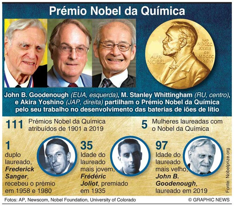 O Prémio Nobel da Química foi, esta quarta-feira, atribuído a John B. Goodenough, M. Stanley Whittingham e Akira Yoshino. O prémio distingue os estudos que permitiram o desenvolvimento de baterias de baterias de iões de lítio.