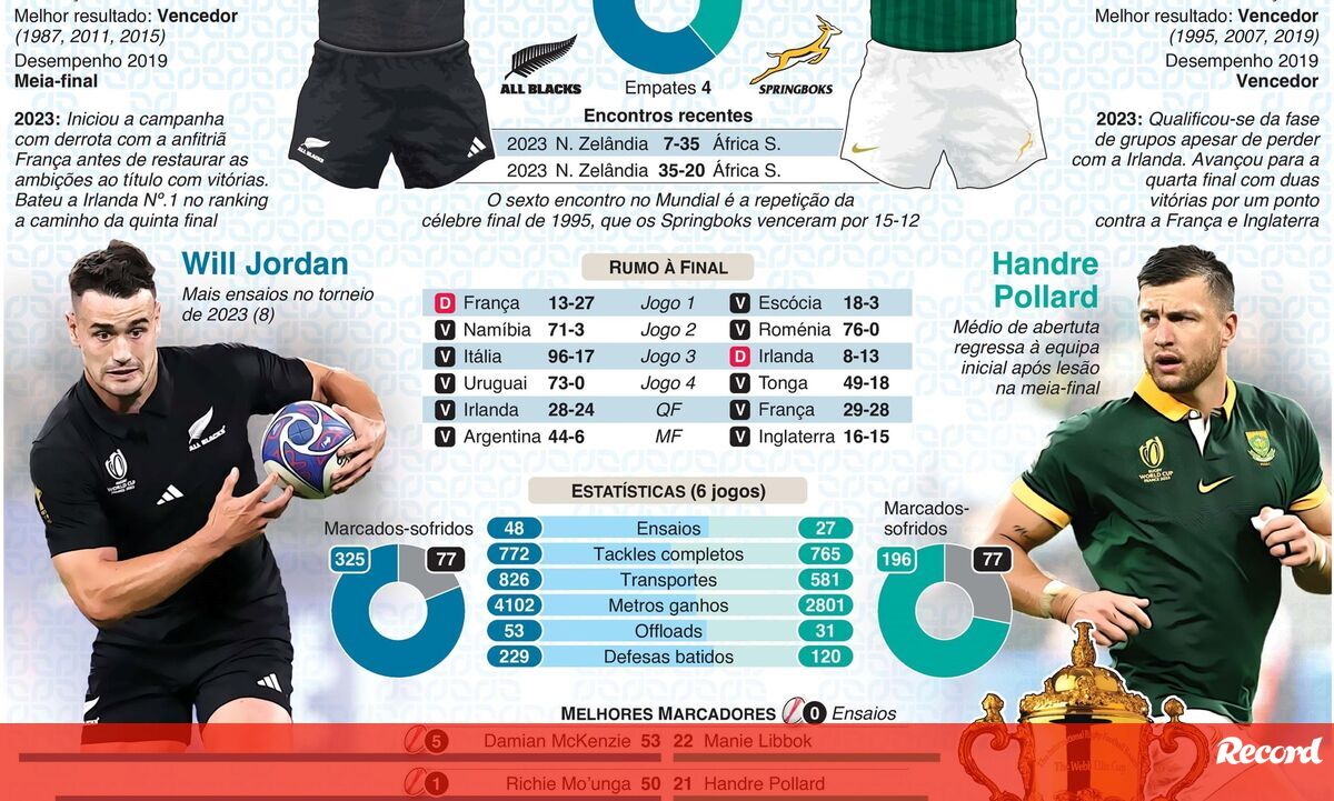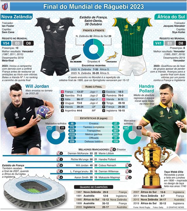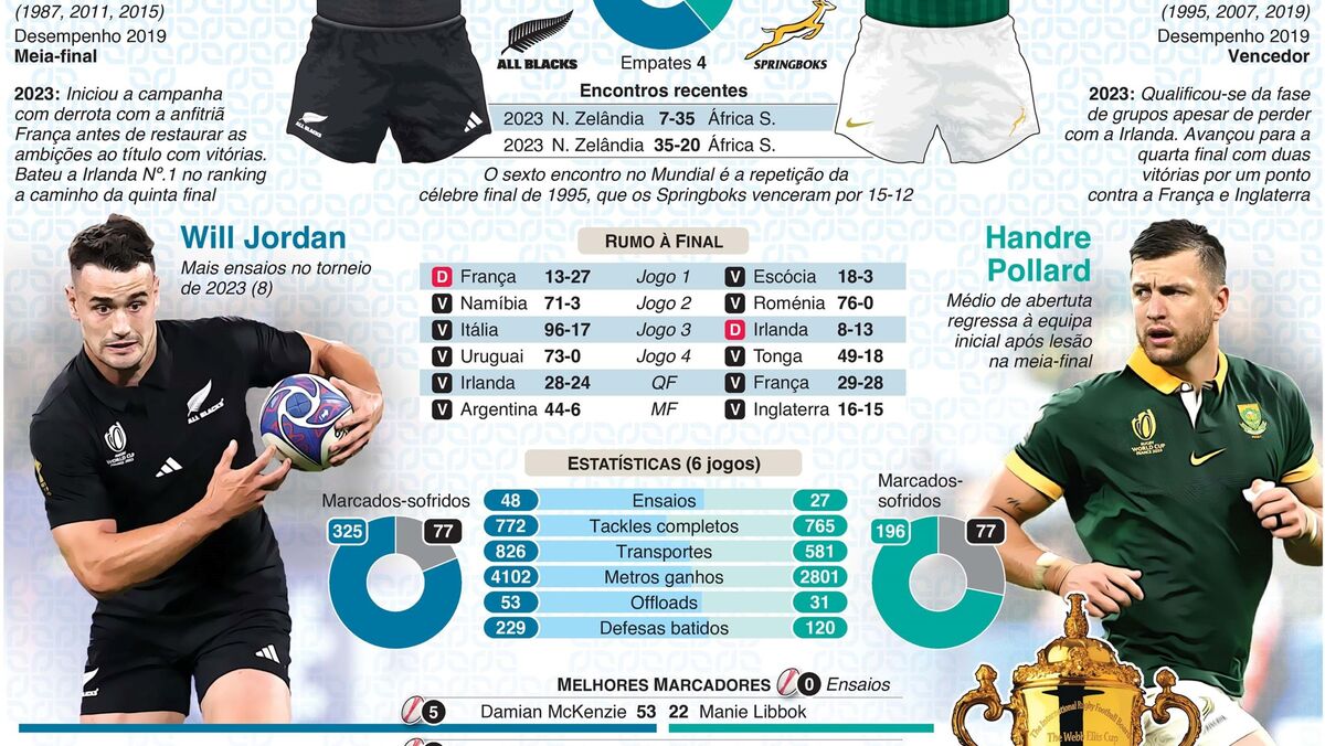 A final do Mundial de Râguebi 2023 tem lugar amanhã, sábado, no Estádio de França (20 horas), com a Nova Zelândia a enfrentar a África do Sul, campeã em título. Ambas as equipas tentam garantir o seu quarto ceptro no Mundial.