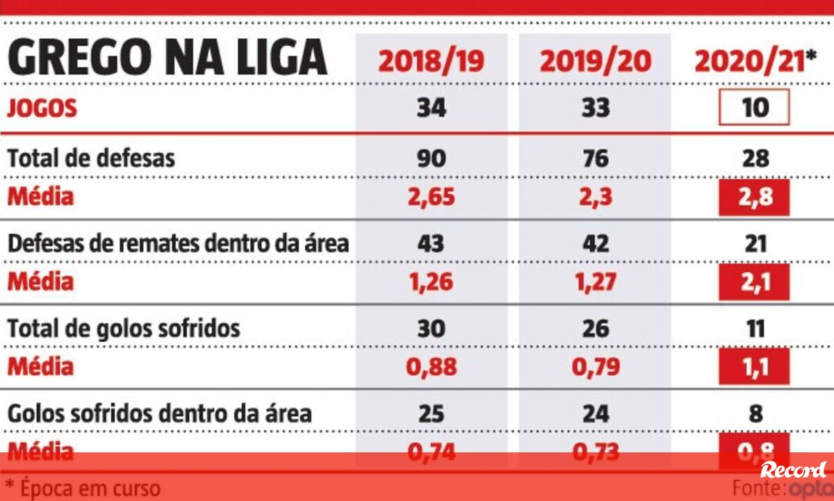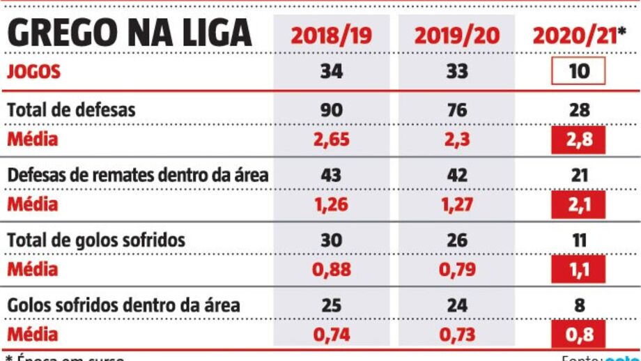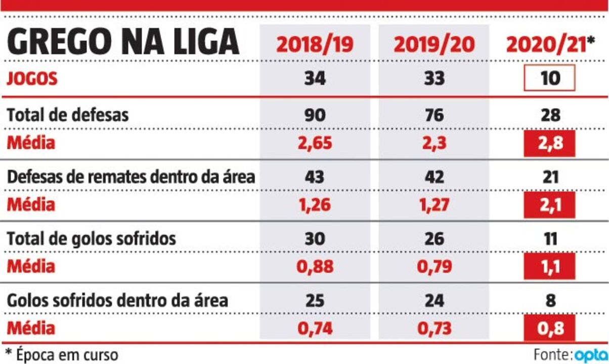 Os números são claros. Vlachodimos tem estado mais exposto do que nunca na baliza do Benfica. Com 10 jogos realizados na Liga 2020/21, o internacional grego apresenta uma média de 2,1 defesas a remates dentro da sua área, uma taxa superior às duas primeiras épocas de águia ao peito