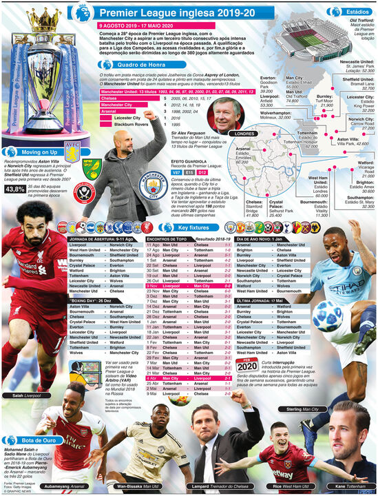 Está quase a arrancar mais uma época da Premier League, com o Manchester City a aspirar a um terceiro título consecutivo após intensa batalha pelo troféu com o Liverpool na época passada. A qualificação para a Liga dos Campeões, as acesas rivalidades e, por fim, a glória e a despromoção serão dirimidas ao longo de 380 jogos altamente aguardados.