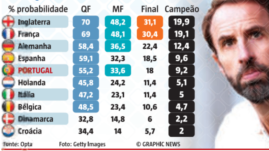 A Inglaterra, treinada por Gareth Southgate, é considerada favorita a vencer o Euro'2024, com probabilidade de 19,9%, ligeiramente à frente da França. Portugal surge em 5.º, também atrás da Alemanha e da Espanha.