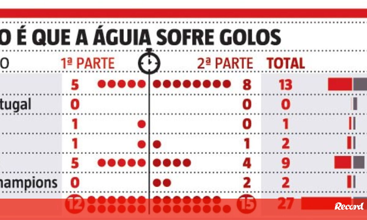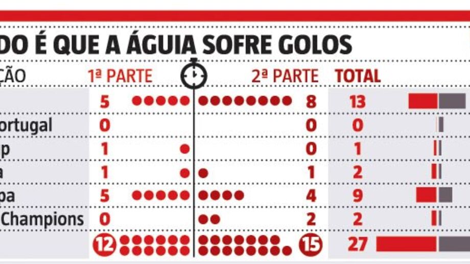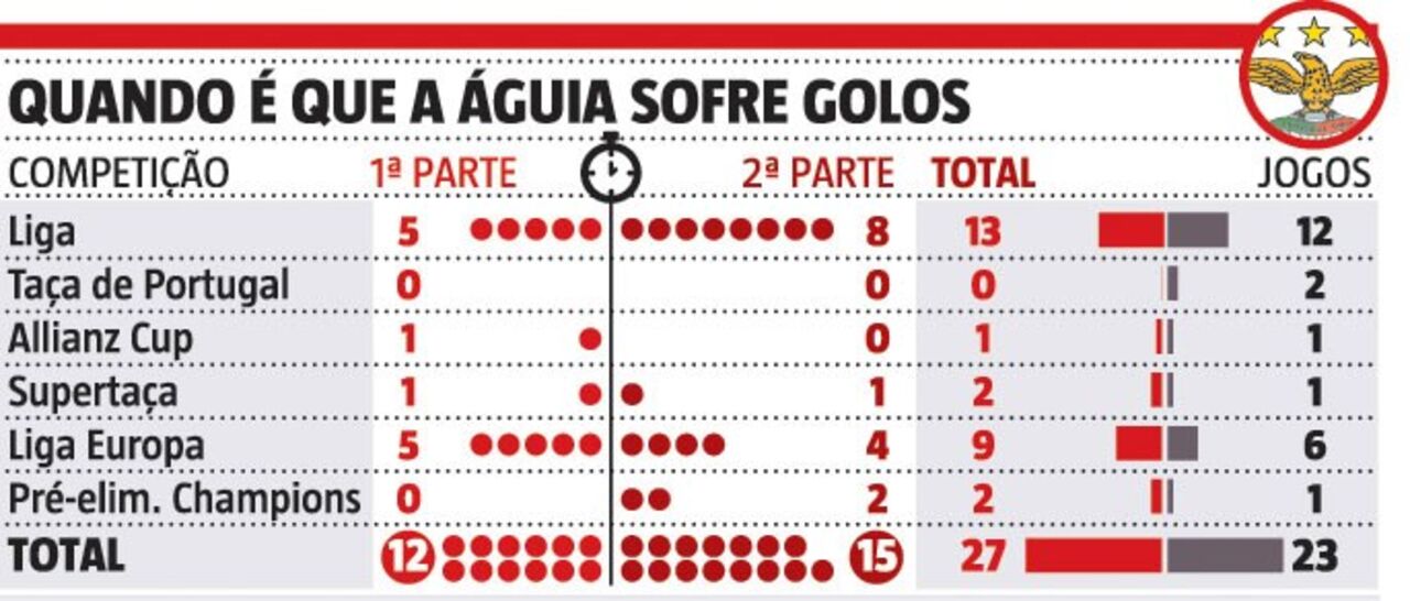 "Em todos os jogos acontece-nos o mesmo, na segunda parte sofremos sempre um golo", lamentou Darwin. Não é assim tão linear como diz o avançado, mas a verdade é que as águias sofreram mais golos nos segundos 45 minutos nos jogos oficiais desta temporada: 15 contra 12 em 27 no total de todas as provas.