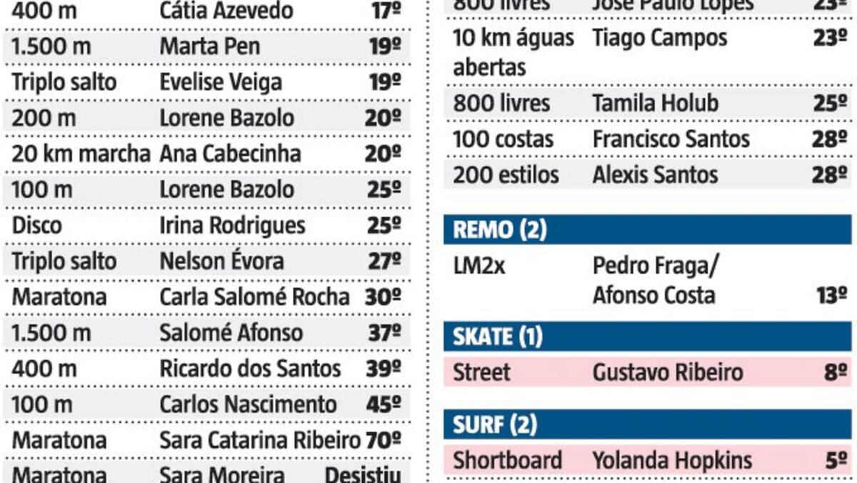 A missão lusa alcançou o melhor resultado de sempre em Jogos: conquistou quatro medalhas – o ouro de Pichardo, a prata de Patrícia Mamona, também no triplo, e o bronze do judoca Jorge Fonseca e do canoísta Fernando Pimenta – e um total de 15 diplomas olímpicos.