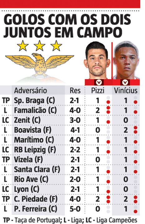 Pizzi e Carlos Vinícius voltaram a ser os protagonistas na vitória do Benfica, com um golo cada, e evidenciaram ainda mais uma particularidade. Juntos são um perigo à solta! Nos 15 jogos em que coincidiram em campo, tanto o médio como o avançado registaram 11 remates certeiros cada, 22 no total. De resto, só em quatro deles, nenhum dos dois jogadores conseguiu fazer o gosto ao pé.