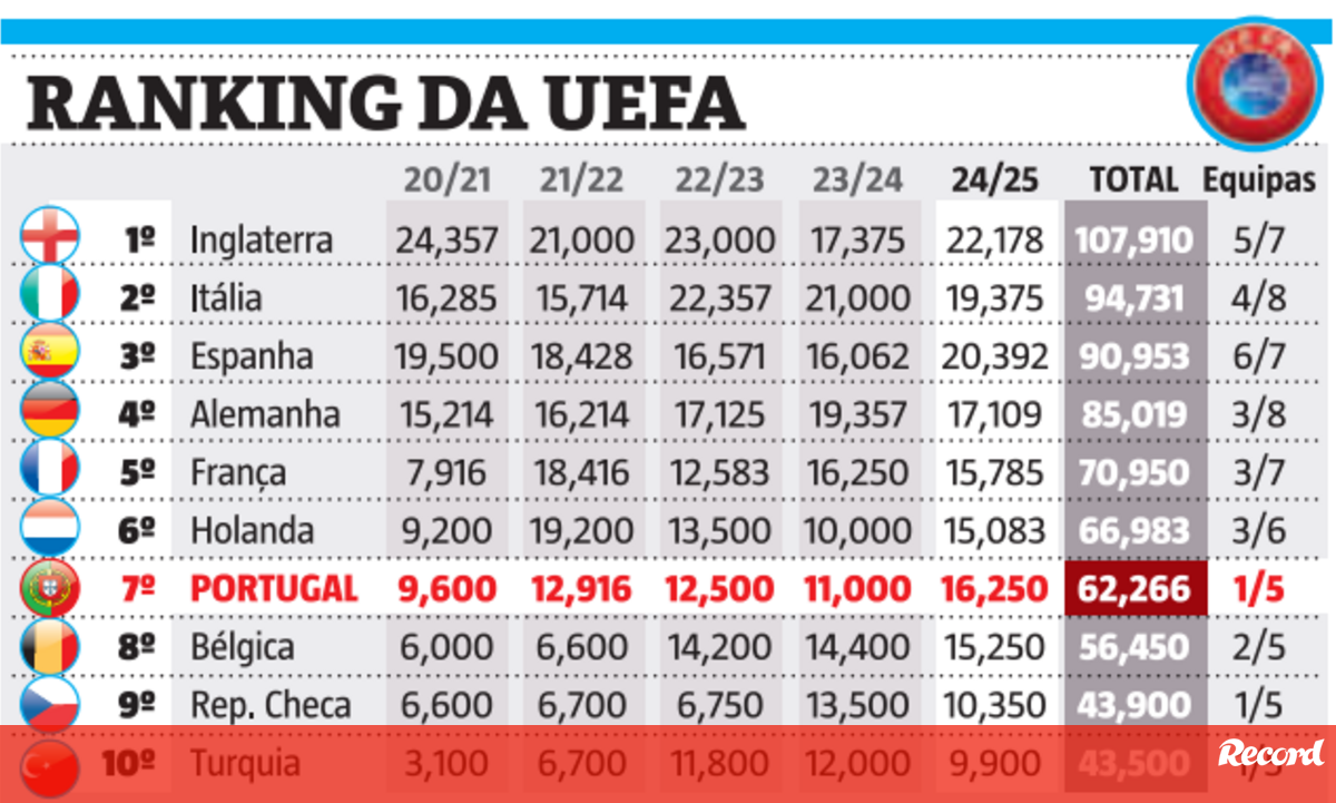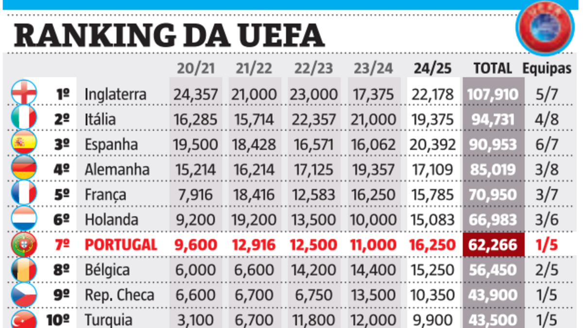 Ranking da UEFA: assim está a classificação de Portugal após o adeus do Benfica à Champions