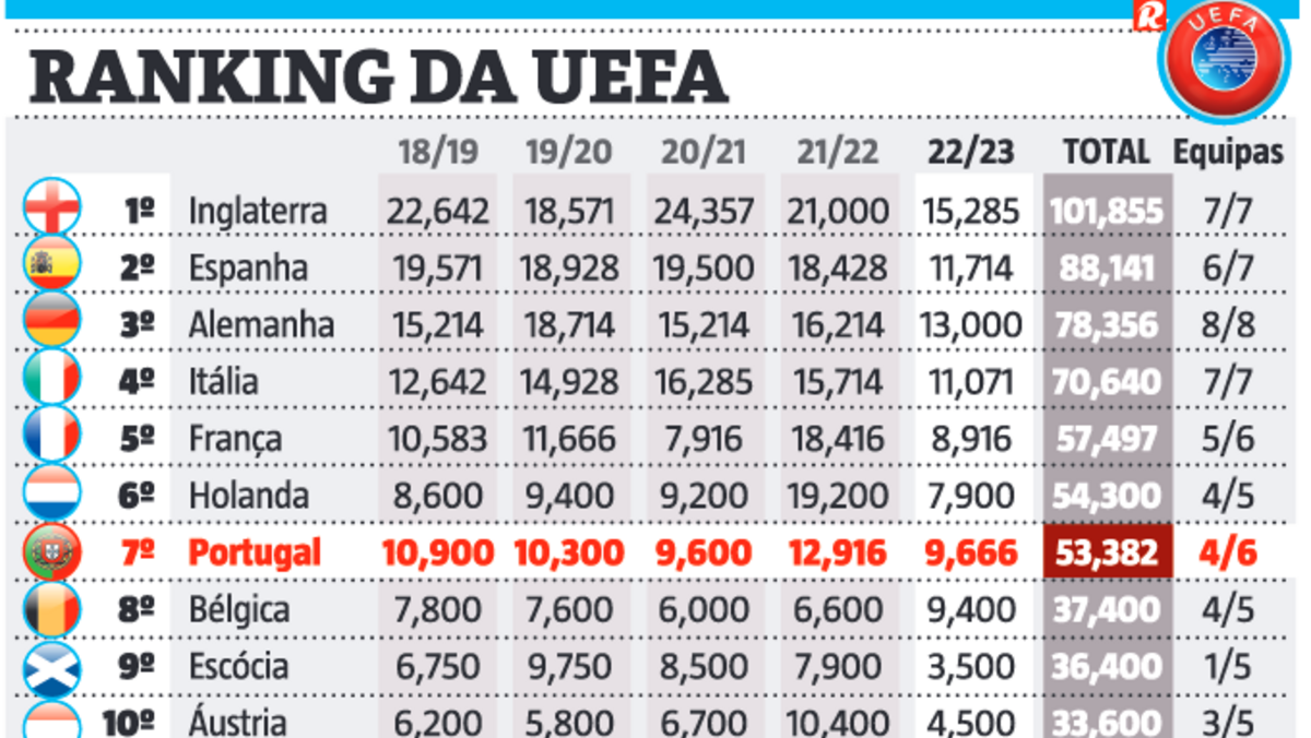 Mais perto. A goleada do Benfica em Israel permitiu a Portugal recuperar algum terreno para a Holanda na luta pelo 6.º lugar do ranking da UEFA. A diferença ficou reduzida a 0,918 pontos, mas pode voltar a aumentar hoje, pois há três equipas holandesas em ação na Liga Europa e na Liga Conferência, contra uma portuguesa (Sp. Braga). E o pior é que PSV e AZ já estão apurados para a próxima fase e o Feyenoord também está bem colocado para o conseguir.