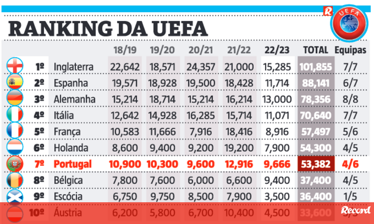Ranking da UEFA: Goleada do Benfica permite a Portugal recuperar terreno