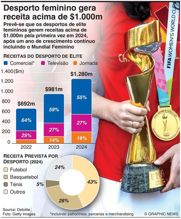 Prevê-se que os desportos de elite femininos gerem receitas acima de 1.000 milhões de dólares pela primeira vez em 2024 (930 milhões de euros), após um ano de crescimento contínuo incluindo o Mundial Feminino.