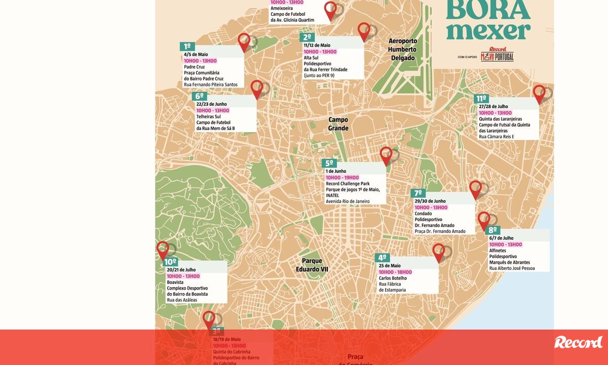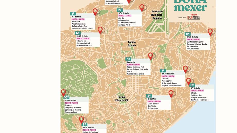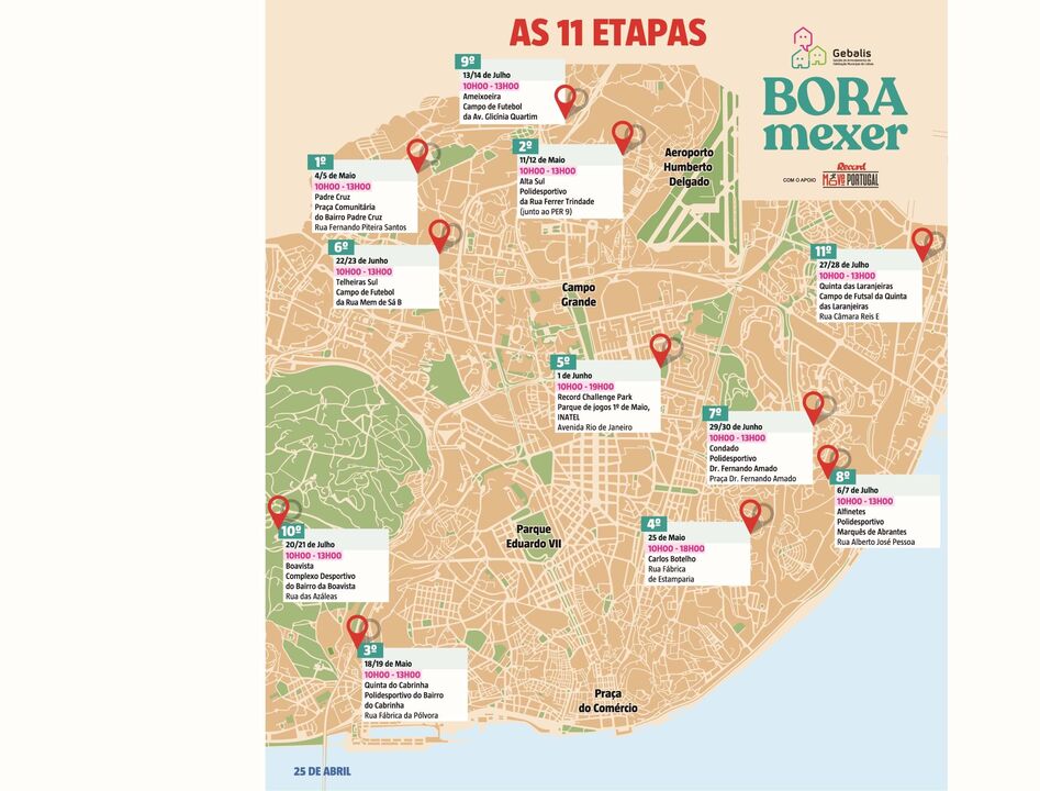 Vários recantos de Lisboa ficarão marcados por muita agitação e diversão nos próximos três meses. É já no sábado que arranca o ‘Bora Mexer’, uma iniciativa da Gebalis, empresa que faz a gestão do arrendamento da habitação municipal de Lisboa, com apoio do Record, sendo a primeira que terá a marca ‘Record Move Portugal’. São 10 os bairros da capital ‘convocados’ para receberem, a cada fim de semana, intensas jornadas de divertimento com... muitos desportos à mistura. Fique a conhecer todas as etapas e... não se esqueça de aparecer!