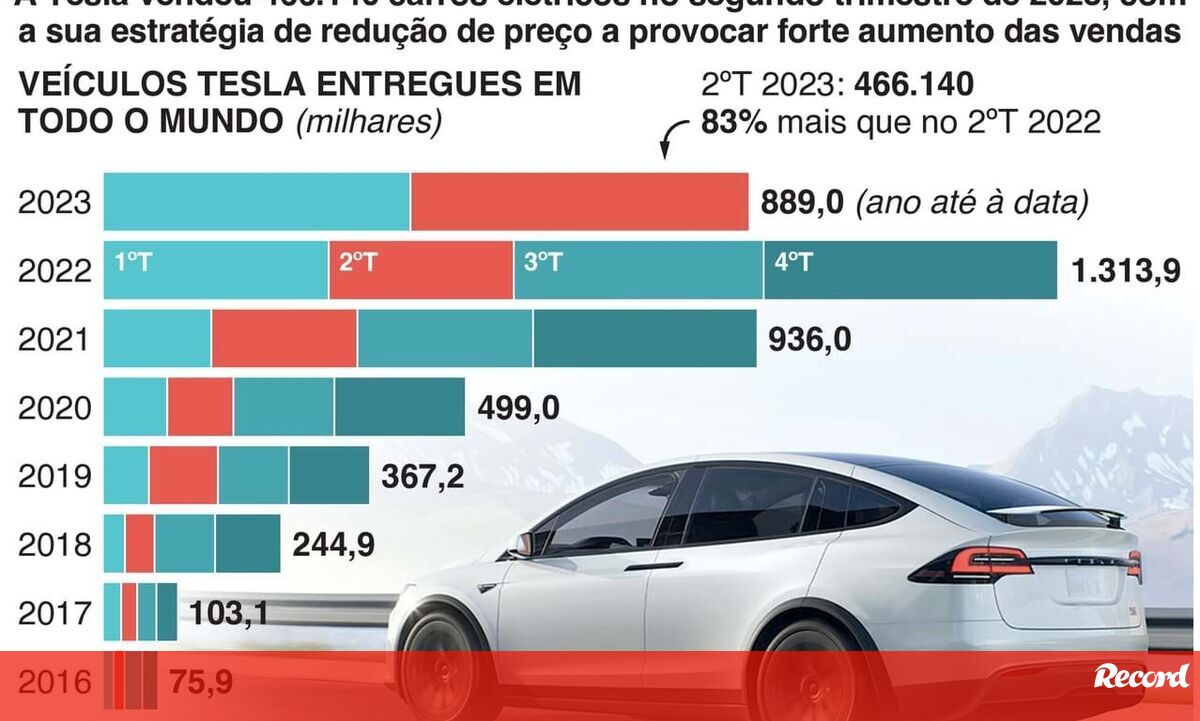 A Tesla vendeu 466.140 carros elétricos no segundo trimestre de 2023, com a sua estratégia de redução de preço a provocar forte aumento das vendas.