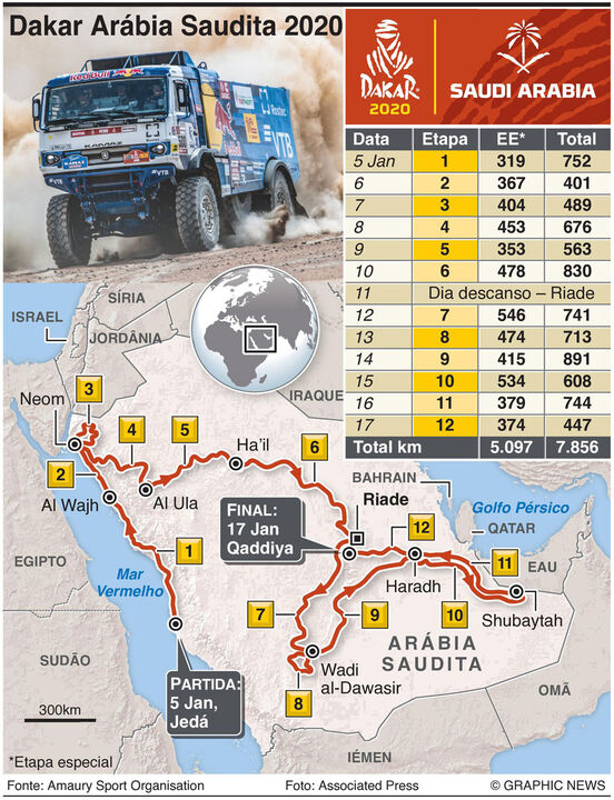 O rali Dakar de todo-o-terreno de 2020 será disputado pela primeira vez na Arábia Saudita, com 75% do percurso em areia.