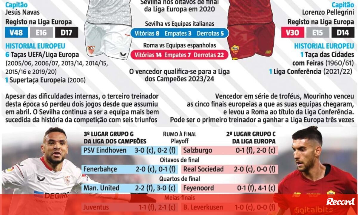 A Roma defronta hoje o Sevilha na final da Liga Europa, com o treinador português José Mourinho a tentar conquistar o segundo troféu europeu consecutivo para os italianos, frente ao recordista de títulos na prova.