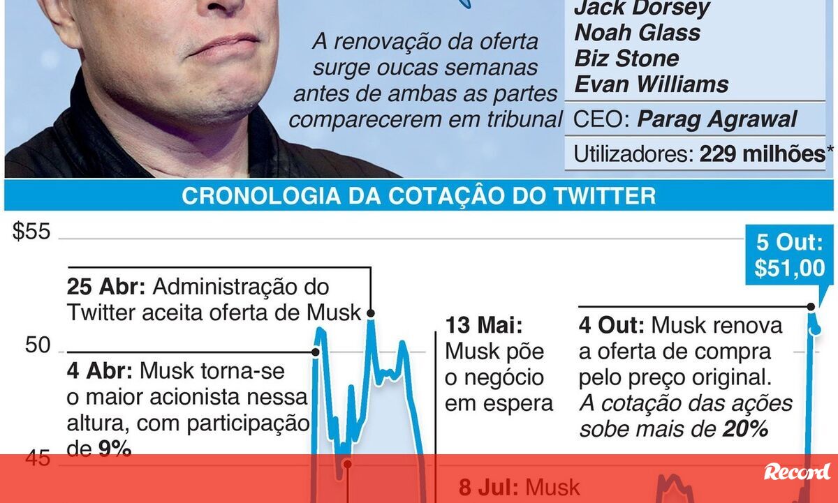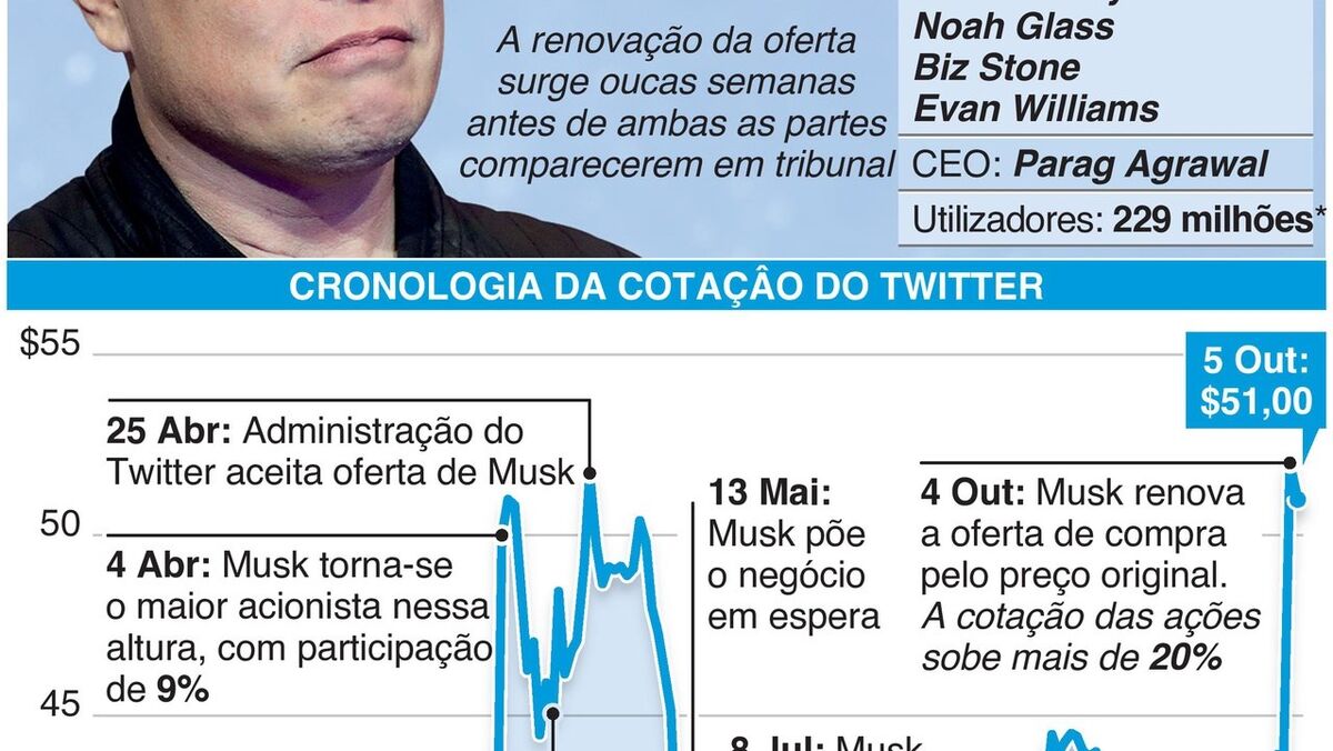 A compra "anda, não anda" do Twitter pelo milionário Elon Musk volta a encarrilar após uma viragem em que Musk concorda pagar o preço da oferta original de 44 mil milhões de dólares.
