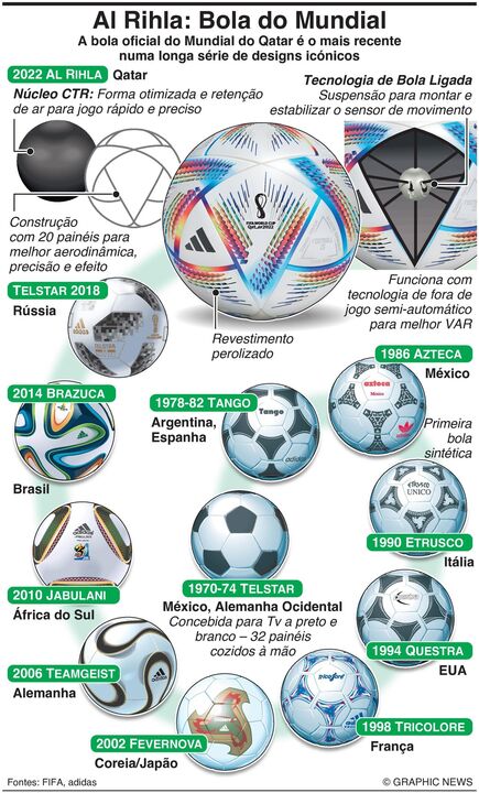 A Al Rihla, da Adidas, é a bola oficial do Mundial'2022, a última de uma longa série de designs icónicos.