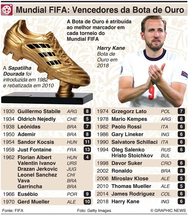 O Campeonato do Mundo arranca no Qatar no próximo dia 20. A Bota de Ouro é atribuída ao melhor marcador em cada torneio. Em 2018, Harri Kane recebeu o troféu ao marcar por seis vezes, enquanto Just Fontaine da França detém o recorde de mais golos, com 13 em 1958.