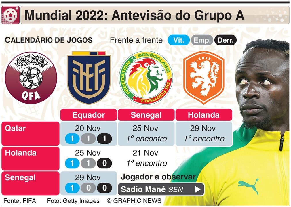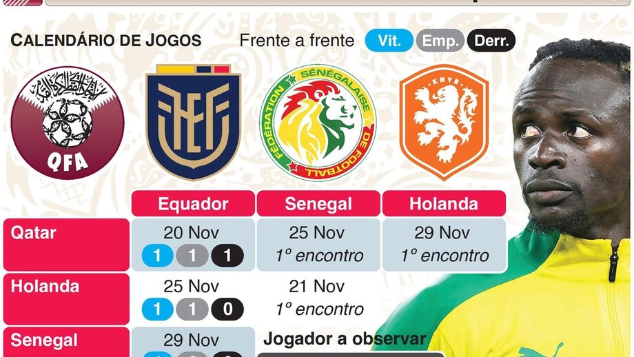 O Grupo A inclui o país anfitrião, o Qatar, mais o Equador, Holanda e Senegal.