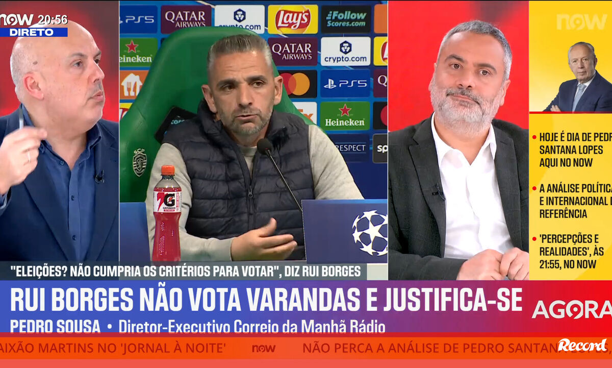Sérgio Krithinas, diretor excecutivo de Record, Rafael Soares, jornalista de Record, e Pedro Sousa, diretor executivo da CM Rádio, em análise no programa 'Record na Hora' no Now sobre o facto de Rui Borges, treinador do Sporting, não ter votado nas eleições presidenciais do clube por não reunir os "critérios certo".