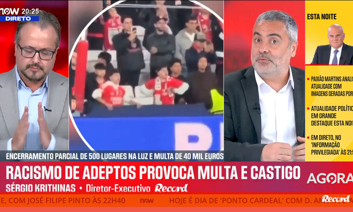 O Benfica foi condenado pela UEFA, com pena suspensa durante um ano, pelo comportamento racista e discriminatório de alguns adeptos no jogo com o Real Madrid (0-1), disputado a 17 de fevereiro, a contar para a 1.ª mão do playoff. O organismo que regula o futebol europeu determinou o encerramento parcial de 500 lugares nos setores 10 e 11 do Estádio da Luz. O jogo em questão, recorde-se, ficou marcado pelo alegado insulto racista de Prestianni a Vinícius Júnior, tema que merece análise no programa 'Record na Hora' no Now.
