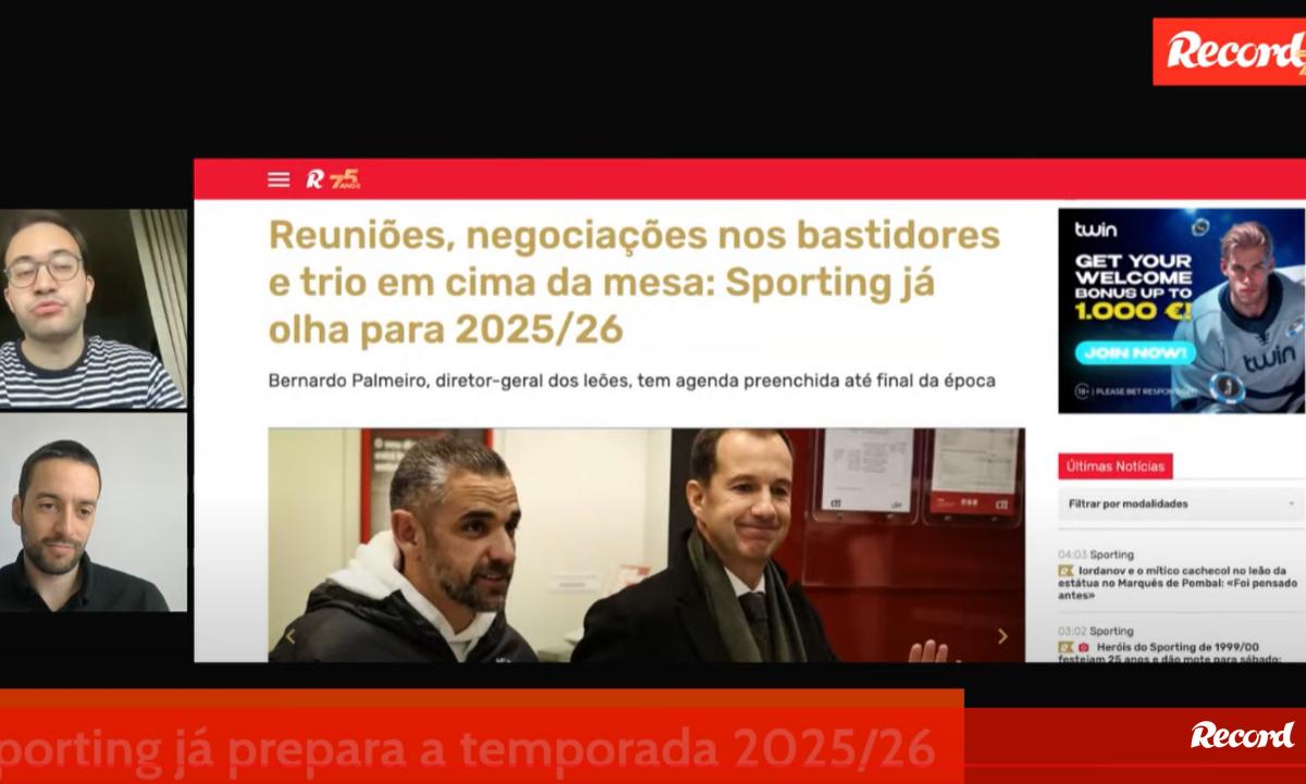 14 maio 2025 - 10:36 10 Minutos Record: três jogadores em cima da mesa no Sporting e 'roubo do verão' à vista Transmissão ao vivo ... × Funcionalidade exclusiva para assinantes Record Premium Assine para partilhar E usufrua de todas as vantagens de ser assinante 1 Deixe o seu comentário Para poder guardar esta notícia deverá efectuar login. Caso não esteja registado no site do Record, efectue o seu registo gratuito. 14.05.2025 10 Minutos Record: três jogadores em cima da mesa no Sporting e 'roubo do verão' à vista 1 Deixe o seu comentário