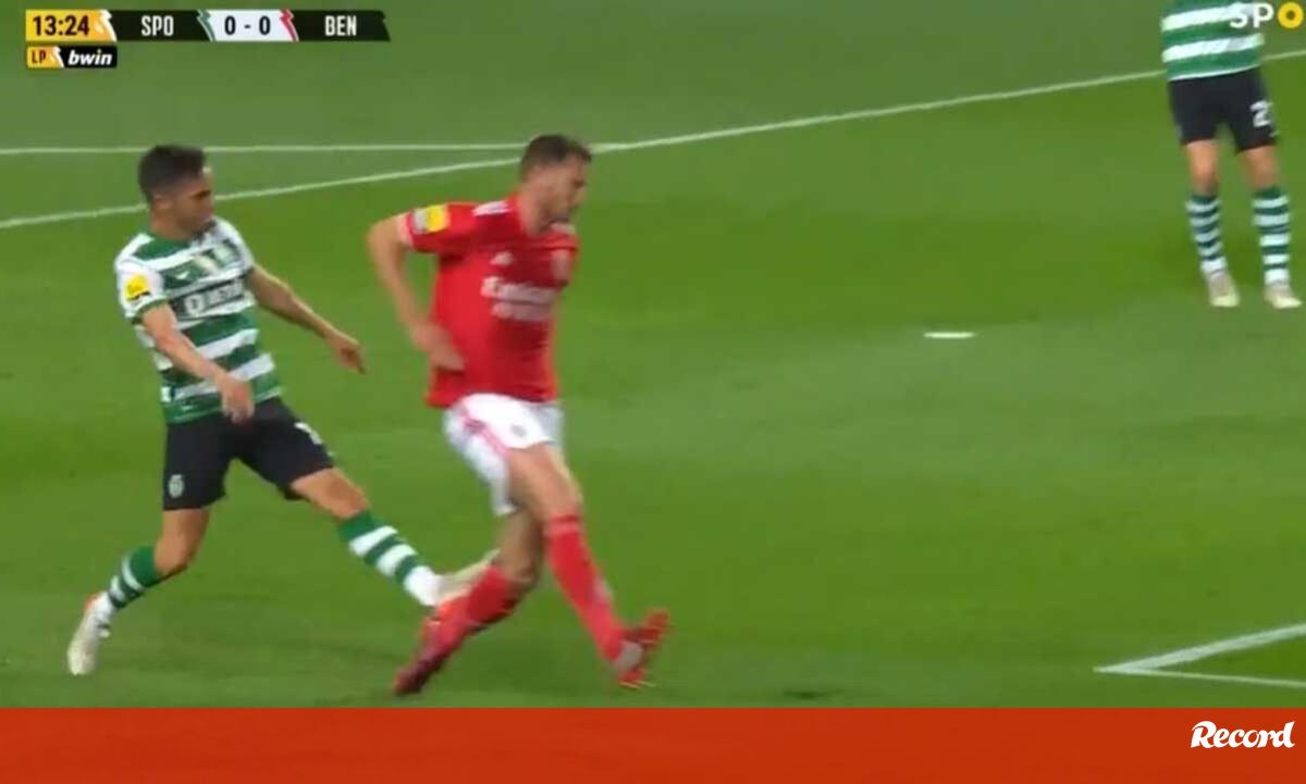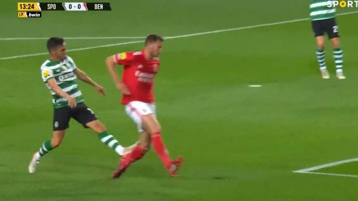 Aos 14' do Sporting-Benfica, Sarabia viu cartão amarelo por esta falta sobre Vertonghen.