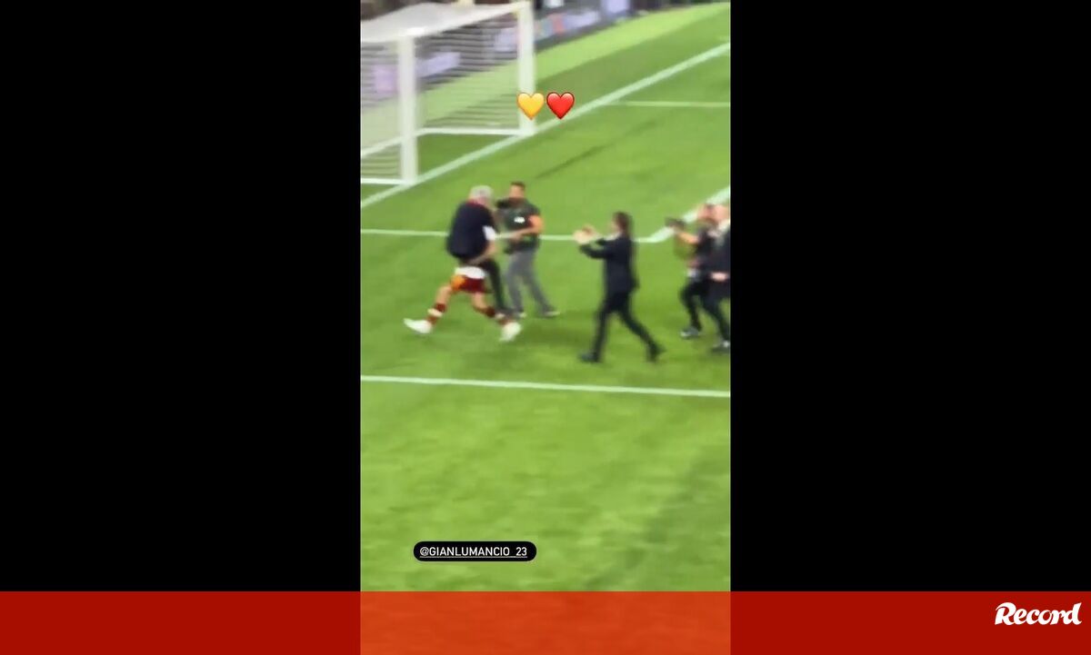 Após o apito final no Roma-Feyenoord (1-0), em que a formação comandada por José Mourinho conquistou a Conference League, a festa fez-se no relvado. Mancini, central dos giallorossi, abraçou o treinador português e levantou-o, correndo em direção aos adeptos italianos que estavam nas bancadas. (Vídeo: Twitter)
