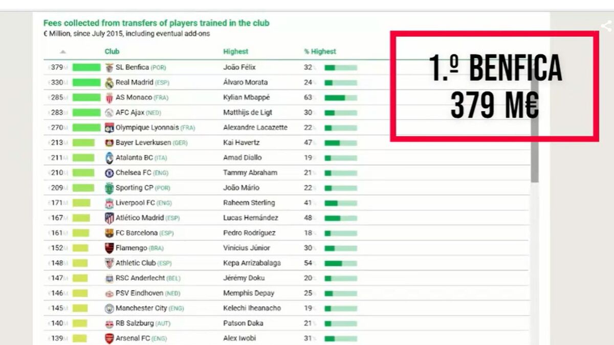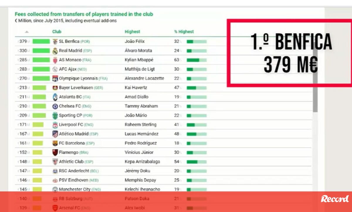 O Observatório do Futebol revelou esta segunda-feira - a primeira publicação estava errada e foi publicada uma correção - os 50 clubes que geraram mais receitas, desde julho de 2015, nas transferências de jogadores da formação (incluiu valores adicionais nas tranferências. O Benfica lidera, com a venda de João Félix como a maior de todas, seguindo-se Sporting e FC Porto na lista de clubes portugueses.