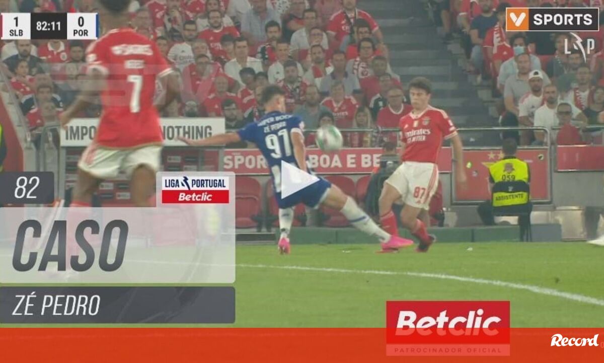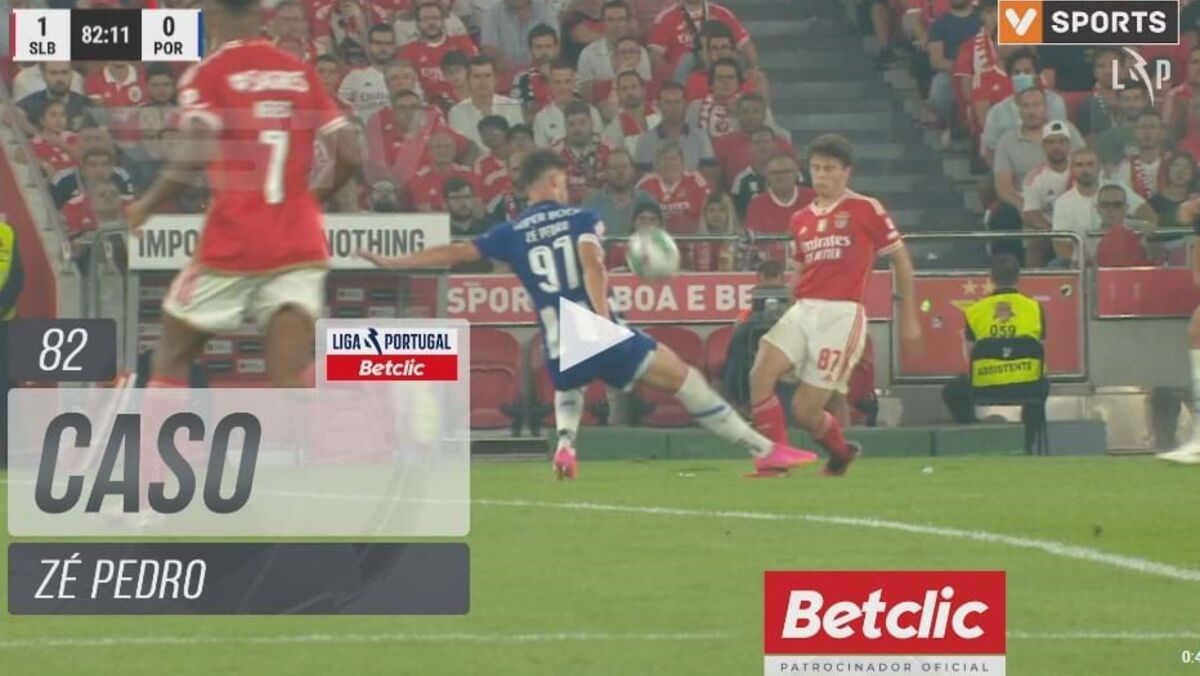 Aos 82' do Benfica-FC Porto, os encarnados pediram vermelho direto para Zé Pedro por entrada sobre João Neves. O árbitro deu amarelo.