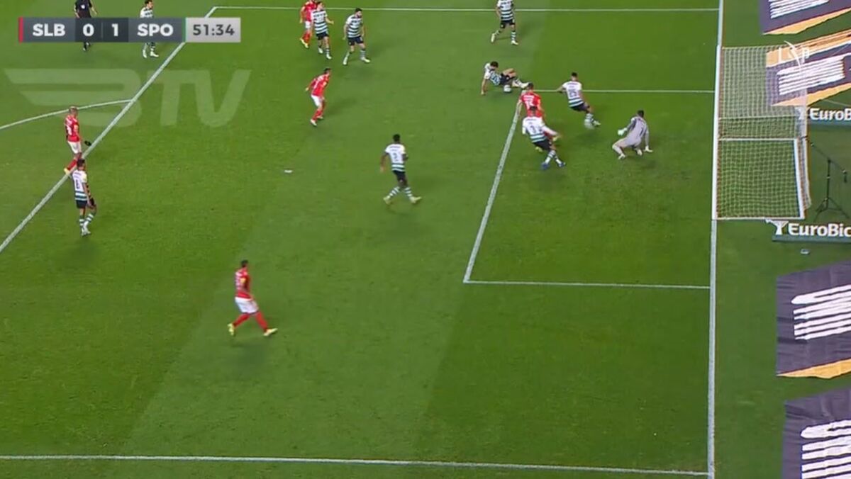 Aos 52' do Benfica-Sporting, pediu-se penálti na Luz por suposta mão de Luís Neto mas o árbitro Artur Soares Dias e o VAR mandaram seguir.