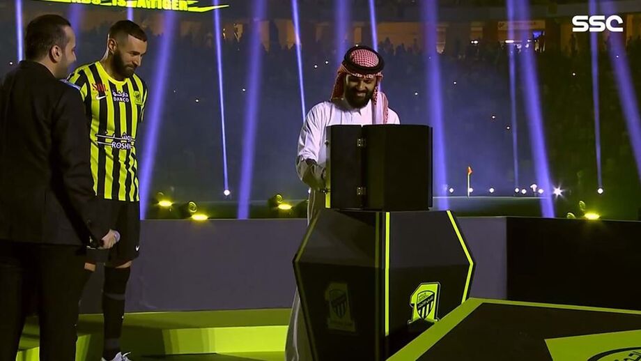 Benzema faz surpresa na apresentação e leva adeptos do Al Itthiad ao delírio