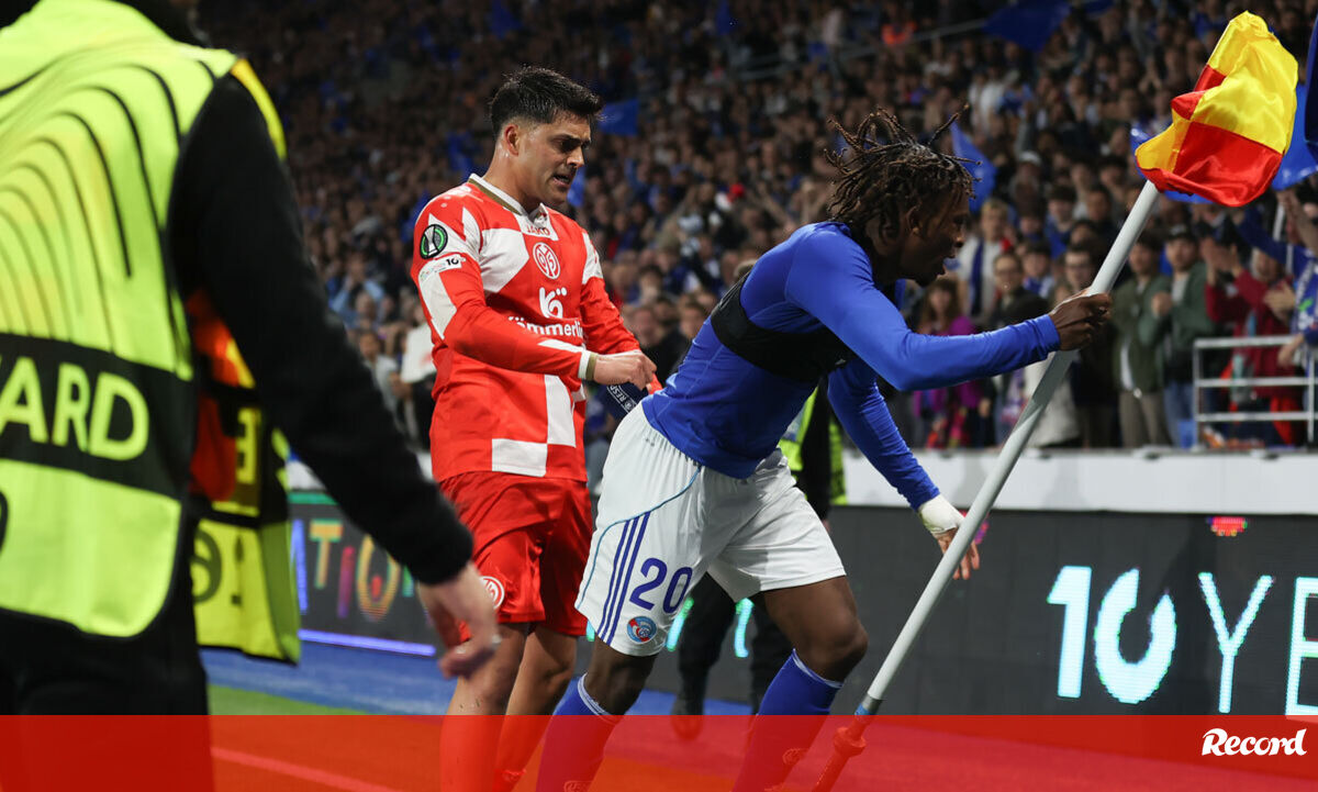 O final do Estrasburgo-Mainz (4-0), a contar para a segunda mão dos 'quartos' da Liga Conferência, ficou marcado por um momento de grande confusão. Martial Godo, avançado da equipa francesa, pegou na bandeirola de canto para festejar, e Nadiem Amiri, do emblema alemão, não gostou e empurrou o jogador do Estrasburgo. Instalou-se o caos, com o árbitro da partida, o português João Pinheiro, a ter de intervir e mostrar vários cartões. Nadiem Amiri acabou expulso [Vídeo: X].