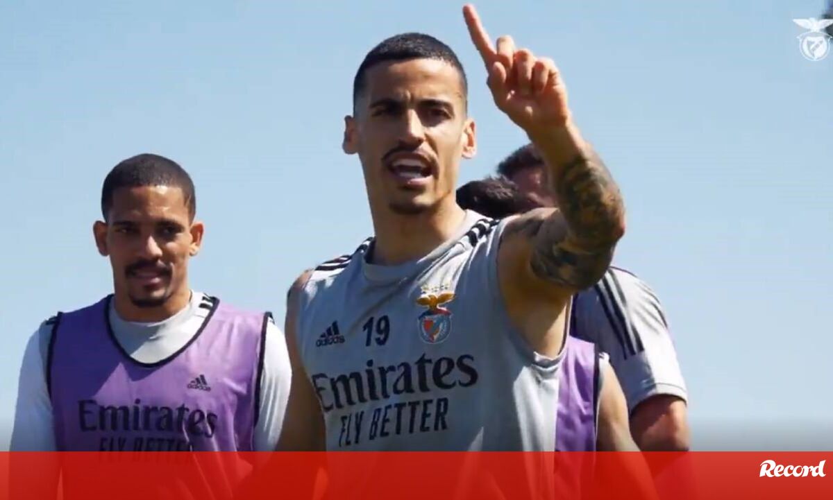 Boa disposição no treino do Benfica, com o médio a revelar 'mau perder'