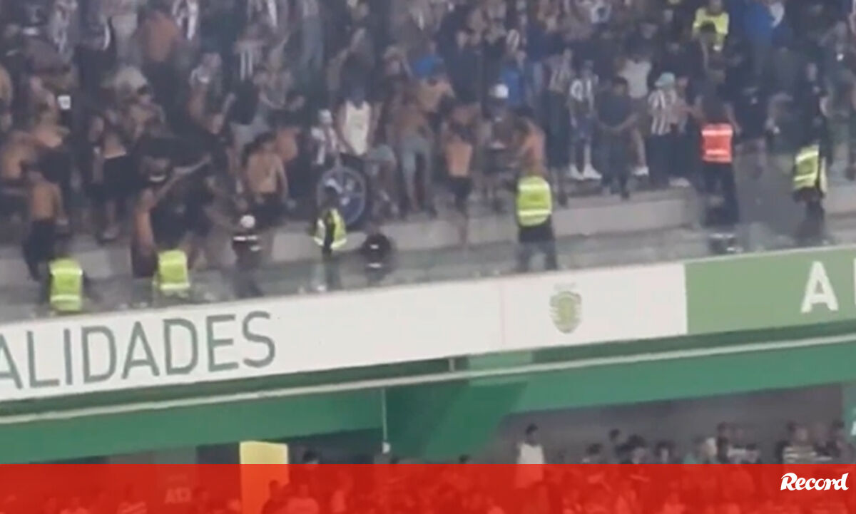 Confusão em Alvalade: o momento em que adeptos do FC Porto partem vidros que caem sobre um setor leonino