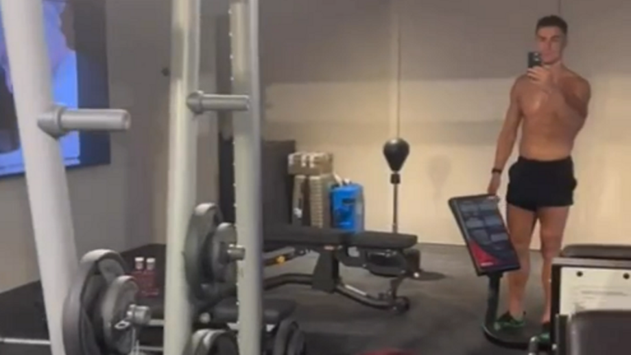 Cristiano Ronaldo mostrou este sábado o ginásio caseiro, bem recheado, que utiliza para manter a forma enquanto não assina pelo próximo clube. O avançado português prepara a segunda parte da temporada e é ao som de um cantor português que o faz. Nininho Vaz Maia estava sintonizado na televisão de CR7, a entoar a letra de 'Não Sou Perfeito', aquando da realização deste pequeno vídeo.