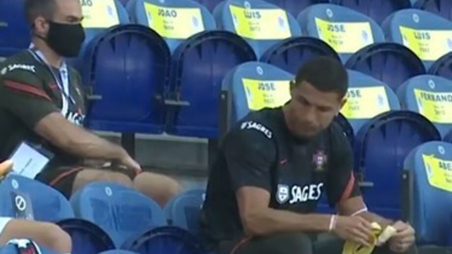 De fora devido a lesão, Cristiano Ronaldo assistiu ao Portugal-Croácia (4-1) na bancada do Estádio do Dragão. A dada altura sem máscara, o craque português foi avisado e lá teve de a voltar a colocar.