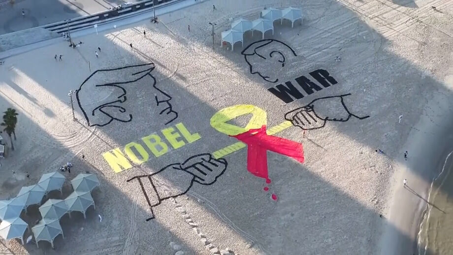 Um desenho gigante com os retratos do presidente dos EUA, Donald Trump, e do primeiro-ministro israelita, Benjamin Netanyahu, foi criado, esta sexta-feira, numa praia em Telavive, Israel. A obra mostra ainda duas mãos a puxar uma corda em torno de uma fita amarela, símbolo dos reféns em Gaza.